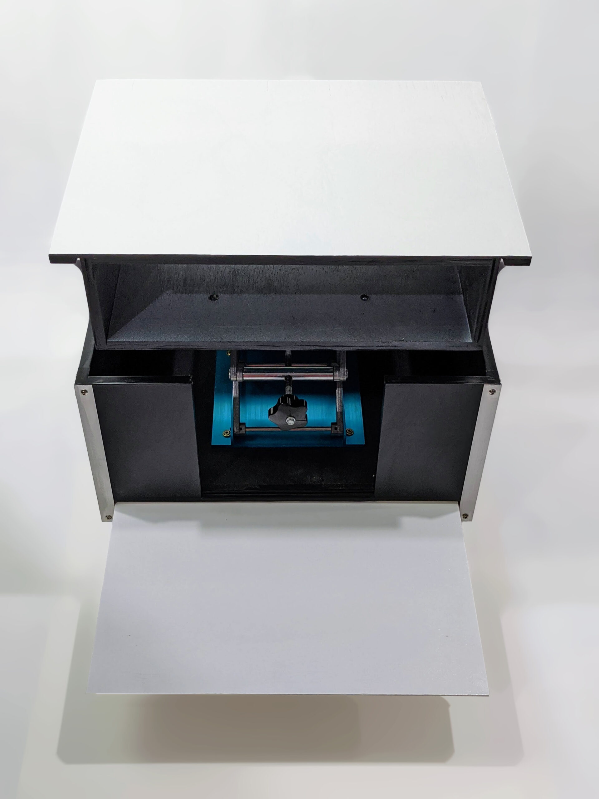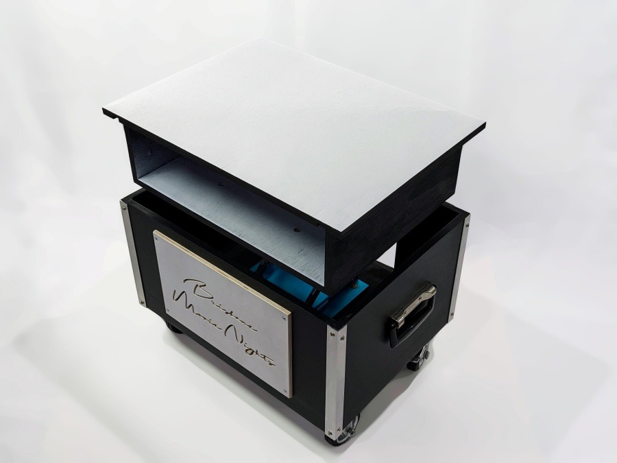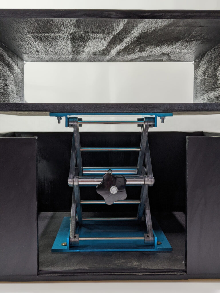 Designed for a high-traffic studio environment, this mobile station solves the challenge of flexible media setups. It features a custom-engineered manual lift mechanism that allows the projector to be safely stowed during transport and elevated to precision height during use. Built with heavy-duty industrial casters and a durable laminate work surface, it’s a rugged, functional piece that brings bespoke craftsmanship to technical equipment.