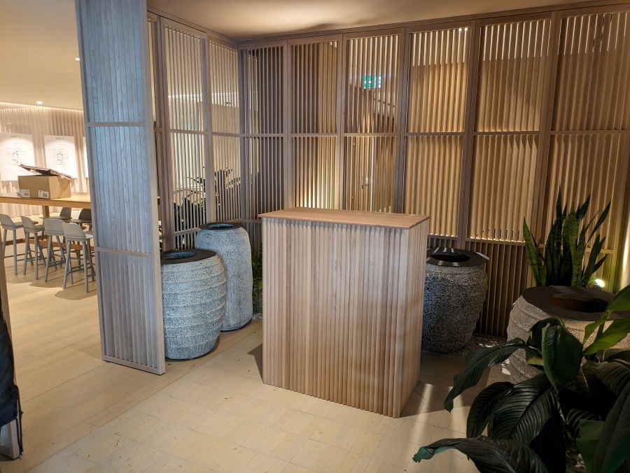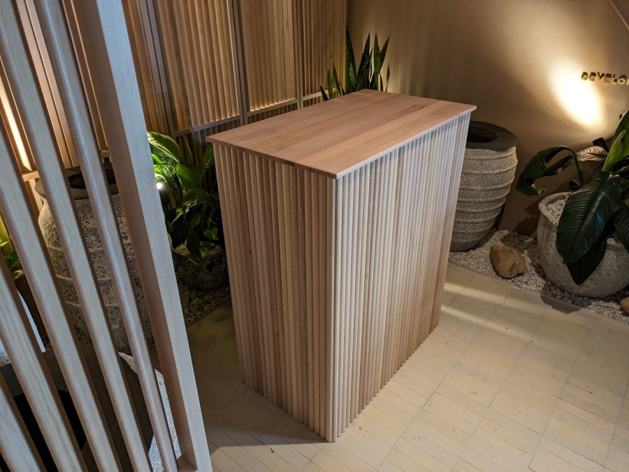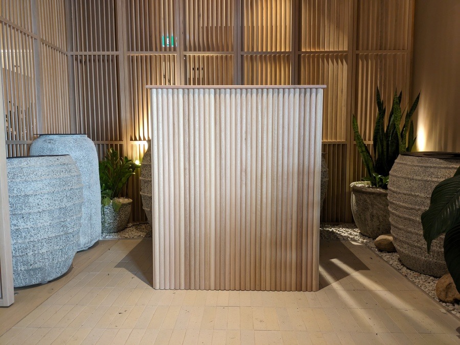A custom-built focal point designed for high-end commercial entryways. This reception counter features precision-aligned Tasmanian Oak vertical slats, creating a rhythmic, textured facade that interacts beautifully with ambient lighting. The minimalist silhouette hides a highly functional internal workspace tailored to professional requirements. Hand-selected for its consistent honey-toned grain, the Tasmanian Oak brings a sense of warmth and natural sophistication to the corporate environment.